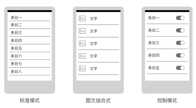垂直式列表一般有三种展示模式,有标准模式,图文模式以及控制模式。